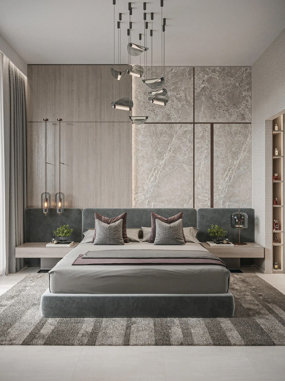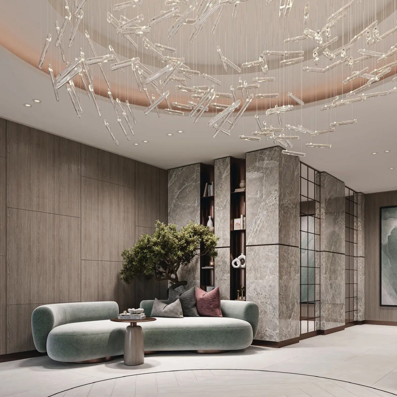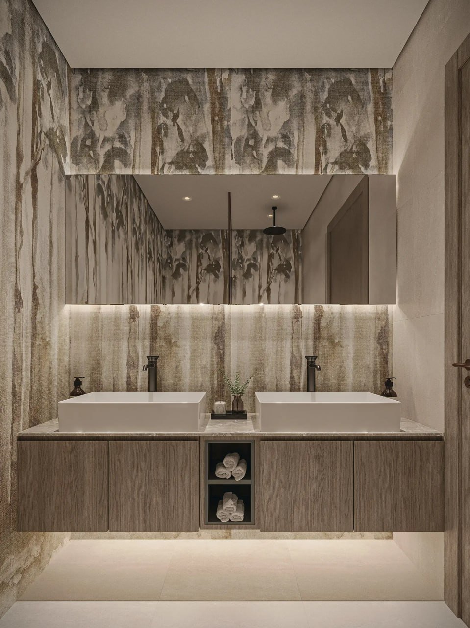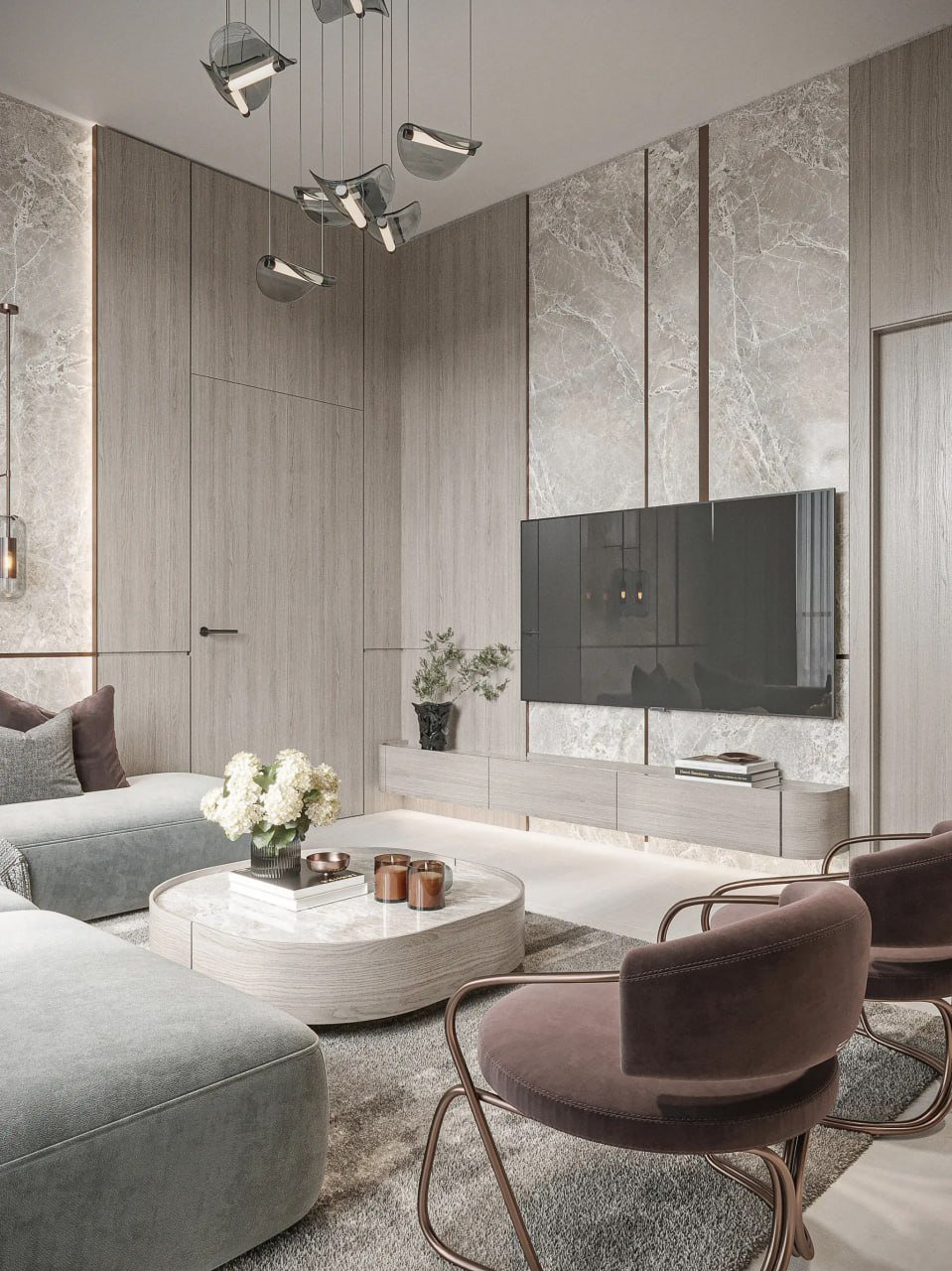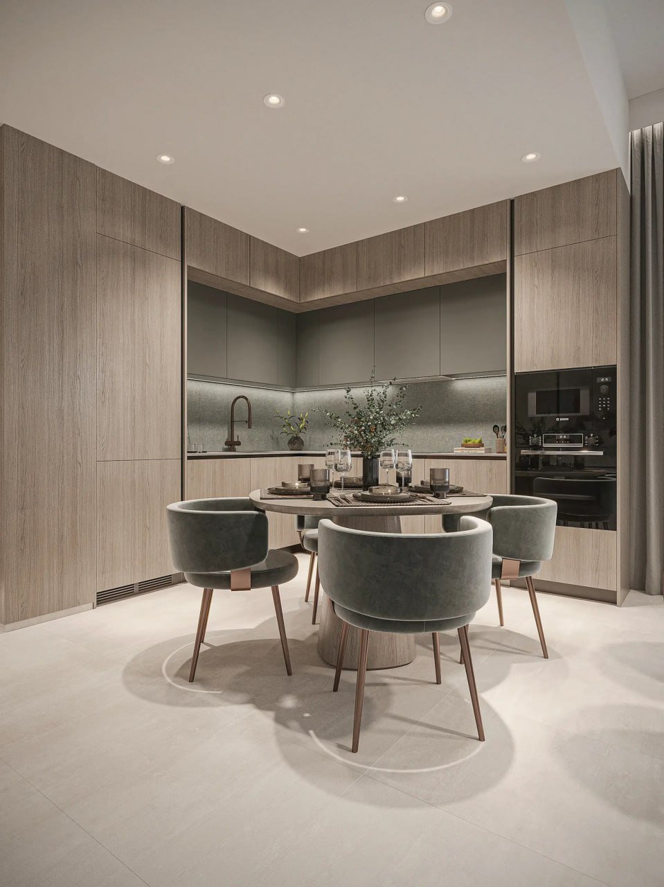 Homes are enhanced with premium European finishes. Living areas feature wood-textured decorative walls, bedrooms come with built-in MDF wardrobes and dresser consoles, and kitchens include Bosch appliances, quartz countertops, porcelain backsplashes, and high-quality European hardware. Bathrooms are outfitted with GESSI, LAUFEN, and IWW fixtures. Each residence includes a full Smart Home System with glass touch panels and digital climate control.